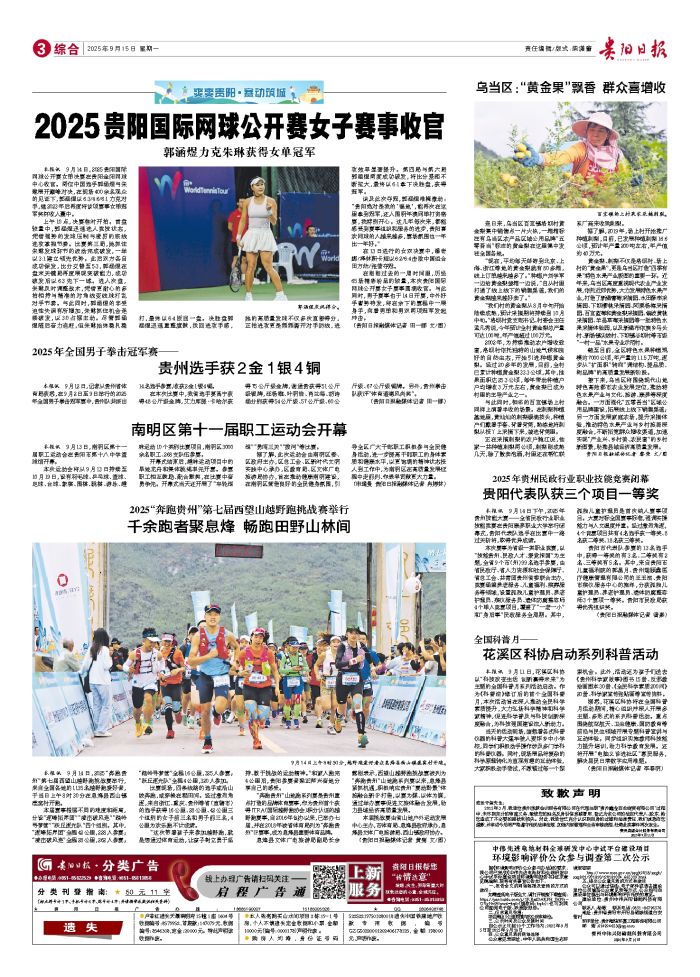 本报讯 9月14日,2025贵阳国际网球公开赛女单决赛在贵阳金阳网球中心收官。两位中国选手郭涵煜与朱琳展开巅峰对决,在现场400余名观众的见证下,郭涵煜以6:3/4:6/6:1力克对手,继2