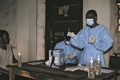 9月13日,在刚果(金)开赛省布拉佩卫生区,医护人员准备注射埃博拉疫苗。新华/传真