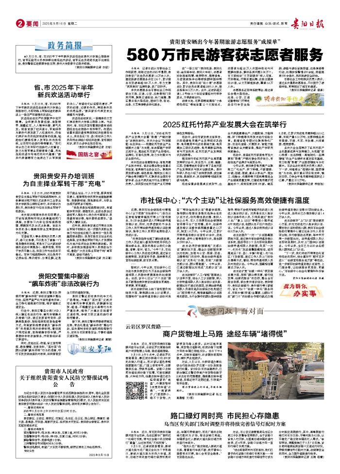 本报讯 记者日前从市委社会工作部获悉,刚刚过去的2025年暑期,贵阳贵安广泛动员志愿者1.4万余人次,建成旅游志愿服务点位134个,累计服务市民游客超580万人次,有力支撑“爽爽贵阳”品牌形