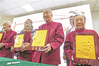 2022年10月4日,南京大屠杀幸存者夏淑琴、葛道荣、薛玉娟和王义隆(前排,从右到左)在侵华日军南京大屠杀遇难同胞纪念馆举办的重阳节活动上展示手印。 新华/传真