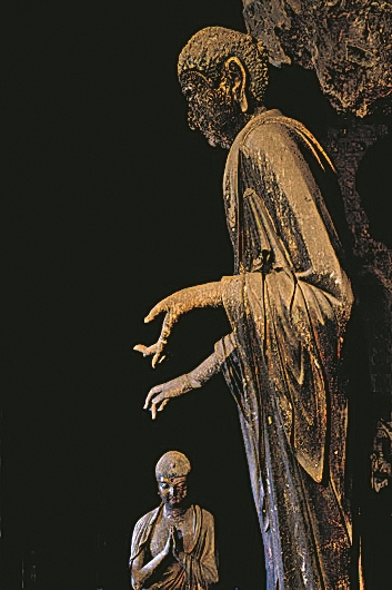 麦积山第133窟的“释迦会子”似乎是个特例,诉说了一段动人的故事。这组宋代雕塑由一大一小两尊立佛组成,大佛高约3.5米,身形高大伟岸,小佛位于大佛右前方,高1.6米,身形瘦小。依据佛经故事,该组造像被命名为“释迦会子”,也叫“罗睺罗授记”。罗睺罗是释迦牟尼出家前的孩子,他6岁时,释迦牟尼回到故乡迦毗罗卫城说法。罗睺罗的母亲对他说:“谁是你的父亲,就去到他身边吧。”小小年纪的罗睺罗从一千多名比丘中认出了父亲,侧身停在他足边。此时,释迦牟尼的表情极为复杂,既有见到儿子的激动与喜悦,又怀着未曾养育儿子的愧疚,同时还要保持佛祖的威严。