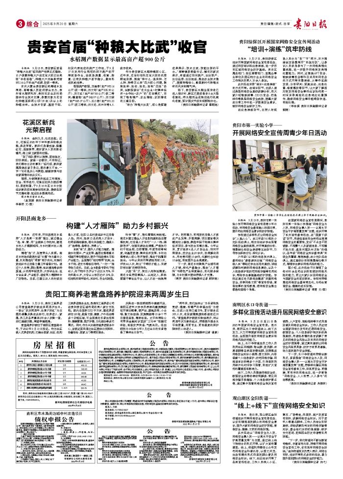 本报讯 9月18日,贵安新区首届“种粮大比武”临田测产结果正式揭晓,10户参赛种粮大户在龙宝大坝交出亮眼“丰收答卷”,种植大户刘逢春凭借905.14公斤的亩产成绩,斩获一等奖。 本次大