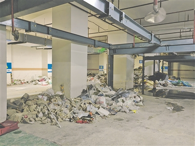 中环国际F区停车场地下三层堆放的建筑垃圾。
