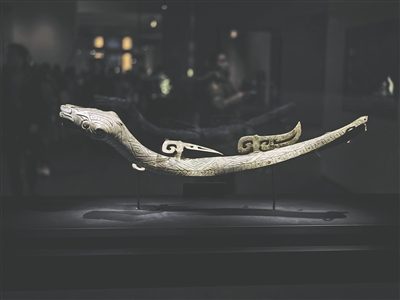 图②:三星堆博物馆展出的商代青铜蛇展品(2025年1月23日摄)。