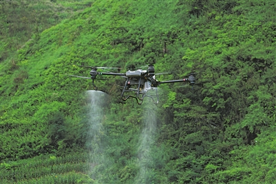 息烽西山贡米种植区采用无人植保机喷洒药剂。