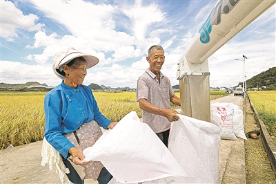 在贵安新区龙宝大坝,农民喜悦地采收水稻。