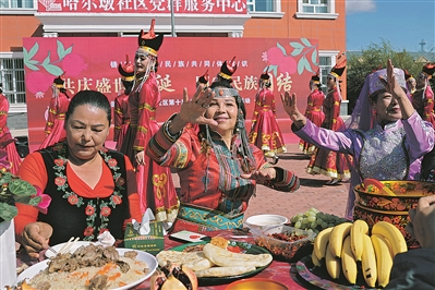 ◀2024年9月27日在新疆塔城市哈尔墩社区拍摄的“邻里节百家宴”活动现场。