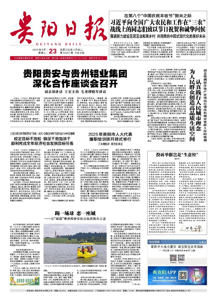 本报讯 9月22日,贵阳贵安与贵州铝业集团深化合作座谈会召开。省委常委、市委书记胡忠雄出席并讲话。 市委副书记、市长王宏主持。贵州铝业集团党委书记、董事长毛勇,党委副书记、副董事长、总