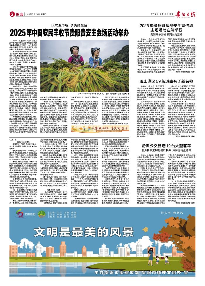 本报讯 9月23日,2025年中国农民丰收节贵阳贵安主会场活动在清镇市红枫湖镇民乐村举行。上千名来自各地的嘉宾、农民代表及旅居度假人员齐聚一堂,共庆丰年、共享硕果。 本次活动由贵阳市委