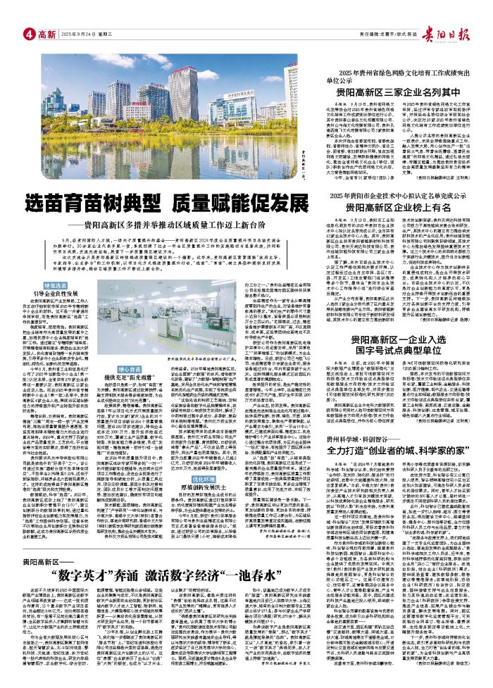 本报讯 9月19日,贵阳市工业和信息化局发布的2025年贵阳市企业技术中心拟认定名单完成公示,全市共有23家企业技术中心入选。其中,贵阳高新区企业共有贵阳银镒新材料科技有限公司、贵州天润达科