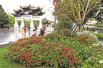 国庆、中秋“双节”即将来临,南明区在辖区景区景点、主次干道、口袋公园等区域布置花卉景观,营造喜庆祥和的节日氛围。图为9月23日拍摄的西湖路甲秀楼牌坊左侧的花卉景观。