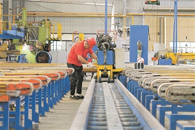 机器轰鸣不息、生产线银光流动、工人麻利操作,一套套铝材封装待发。