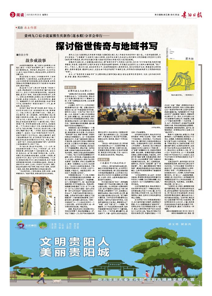 ■作家小传故乡成故事 如美国作家福克纳一般,“在家乡这块邮票大小的地方,掘出一口深井”的作家群中,多了一名贵州九〇后小说家熊生庆。简历显示,熊生庆是一九九四年生人,故乡六盘水市青林乡;现