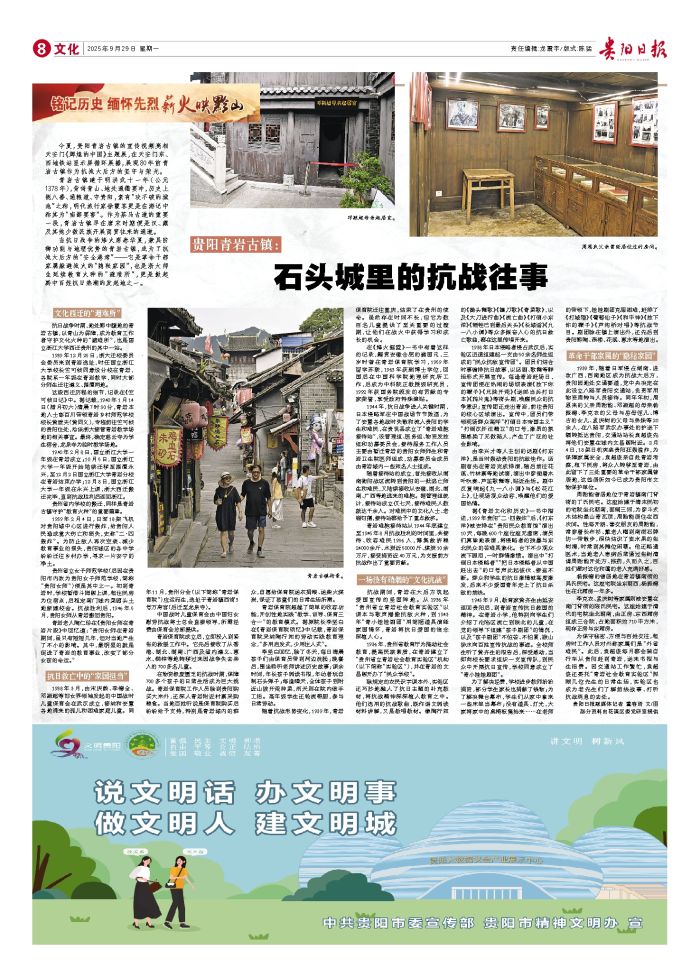 今夏,贵阳青岩古镇的宣传视频亮相天安门《辉煌的中国》主题展,在天安门东、西地铁站显示屏循环展播,展现80年前青岩古镇作为抗战大后方的坚守与荣光。 青岩古镇建于明洪武十一年(公元1378年