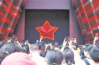 10月3日下午2点半,在贵州长征文化数字艺术馆(红飘带),当日的第五场《红飘带·伟大远征》演出开始,演员手擎飘扬的红旗步入人群,《红飘带·伟大远征》的演出大门徐徐开启,一颗红星出现在观众眼前,现场惊叹声四起,大家纷纷举起手机拍摄。