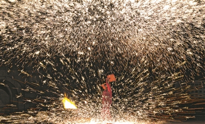 当天,表演还未开始,众多市民游客已早早入场等待。随着夜幕降临,悠扬的乐曲响起,表演拉开帷幕。只见熔炉中铁水翻滚沸腾,泛着耀眼的金红色光芒,表演者一只手拿着盛满铁水的器具,另一只手奋力挥棒击打,炽热的铁水瞬间冲向夜空,化作万千星芒四散飞溅,霎时间将广场点亮。现场欢呼声、惊叹声此起彼伏,大家纷纷举起手机拍下一个个精彩瞬间。