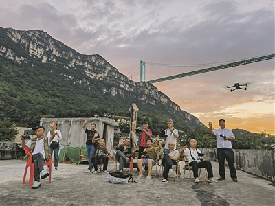 当夕阳的余晖洒向花江村,一栋民房的天台聚集了十多位摄影师,他们手中相机、无人机按键的声音此起彼伏,只为捕捉高桥与晚霞同框的美妙瞬间。