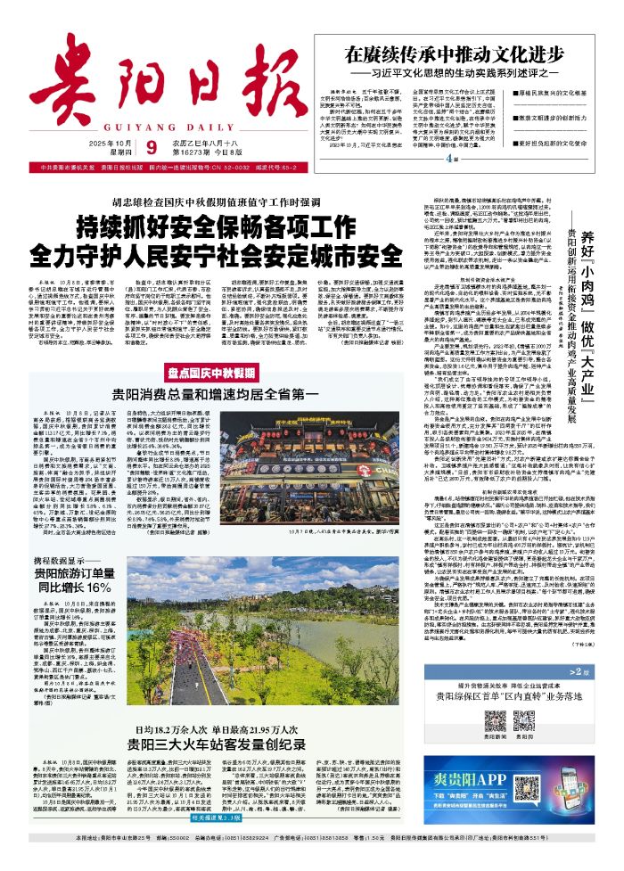 本报讯 10月8日,国庆中秋假期落幕。8天中,贵阳火车站管辖的贵阳北、贵阳东和贵阳三大贵州铁路重点客运站累计发送旅客145.65万人次,日均18.2万余人次,单日最高21.95万人次(10月