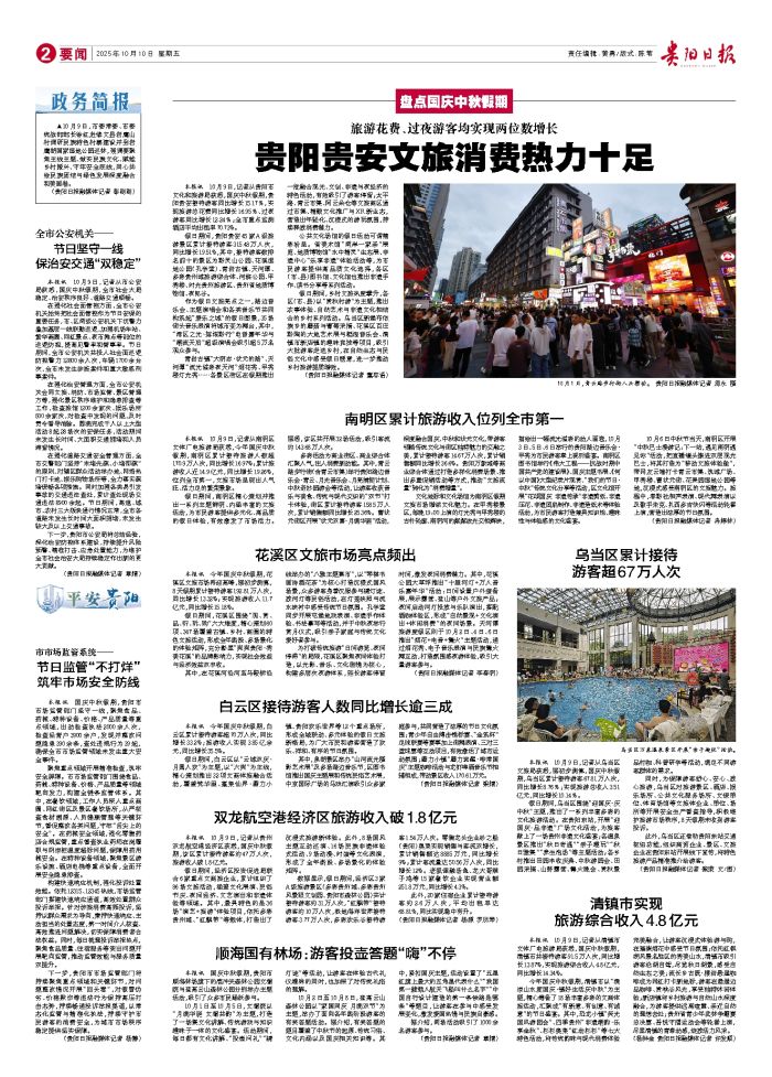 假日期间,花溪区围绕“观、赏、品、听、玩、购”六大维度,精心策划60项、347场覆盖古镇、乡村、商圈的特色文旅活动,形成全年龄段、多场景化的体验矩阵,充分彰显“爽爽贵阳·秀美花溪”的品牌影响力,实现社会效益与经济效益双丰收。