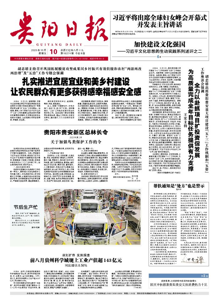 本报讯 10月9日,贵阳贵安重大项目建设“5+3”工作机制和“五资”工作座谈会召开。省委常委、市委书记胡忠雄出席并讲话。他强调,要深入学习贯彻习近平总书记在贵州考察时的重要讲话精神,全力以赴