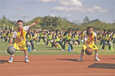 学生在花溪区教育系统第三届“花漾杯”系列赛事开幕式上表演篮球操。