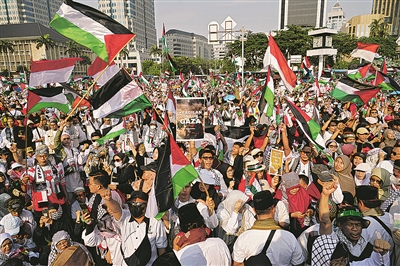 10月12日,在印度尼西亚雅加达,民众举行集会声援巴勒斯坦人民。