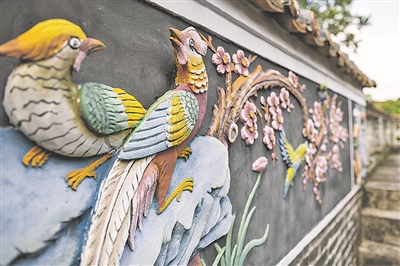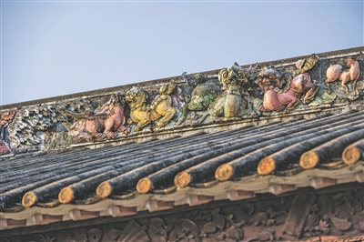 塱头村积墨楼上的灰塑装饰。