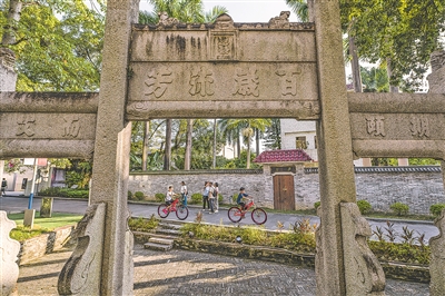 孩子们骑车经过塱头村的升平人瑞牌坊。