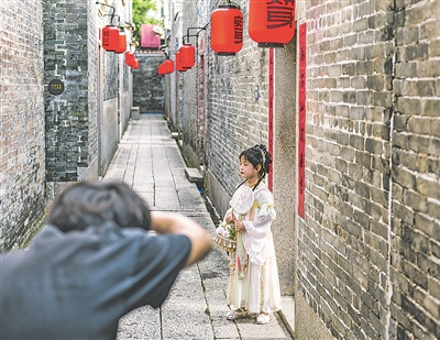 小朋友在塱头村积墨楼拍照。
