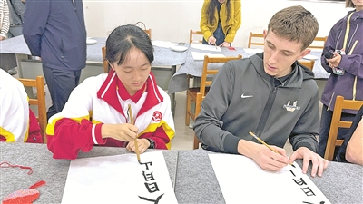 犹他预科学院男子篮球队队员与贵阳一中学生共同体验书法。