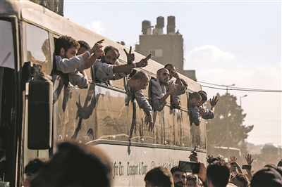 图为10月13日,巴勒斯坦获释人员乘坐大巴回到加沙地带南部汗尤尼斯。
