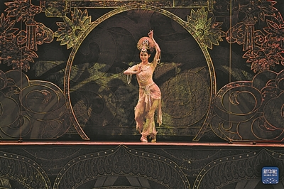 10月12日晚,洞窟式沉浸体验剧《乐动敦煌》在甘肃省敦煌市精彩上演,《乐动敦煌》借助对莫高窟壁画、藏经洞古籍的解读梳理,活化敦煌古乐器、古乐谱研发成果,通过全息投影等手段,结合专业演员的表演,将莫高窟壁画中的乐舞盛景生动再现,让观众沉浸式感悟传承千年的敦煌乐舞文化魅力。图为演员在《乐动敦煌》中表演。 新华/传真