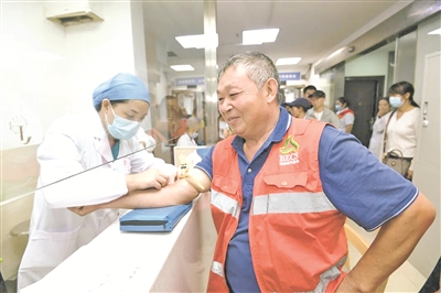图为医务人员正在为环卫工人进行血常规检查。