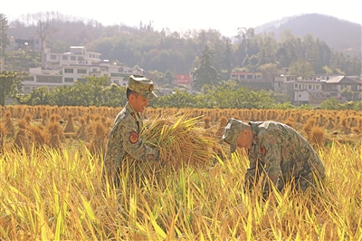 近日,花溪区人武部组织专武干部和基干民兵走进青岩镇思潜村,帮助行动不便、独自生活的村民抢收稻谷。