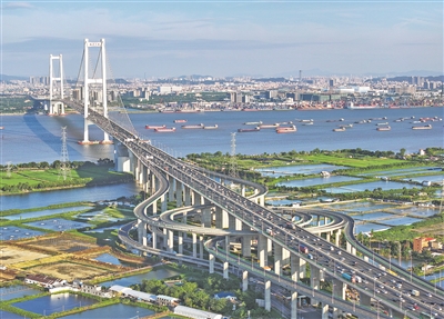 2024年10月2日,广东南沙大桥上的车流和狮子洋水道的船舶来来往往(无人机照片)。
