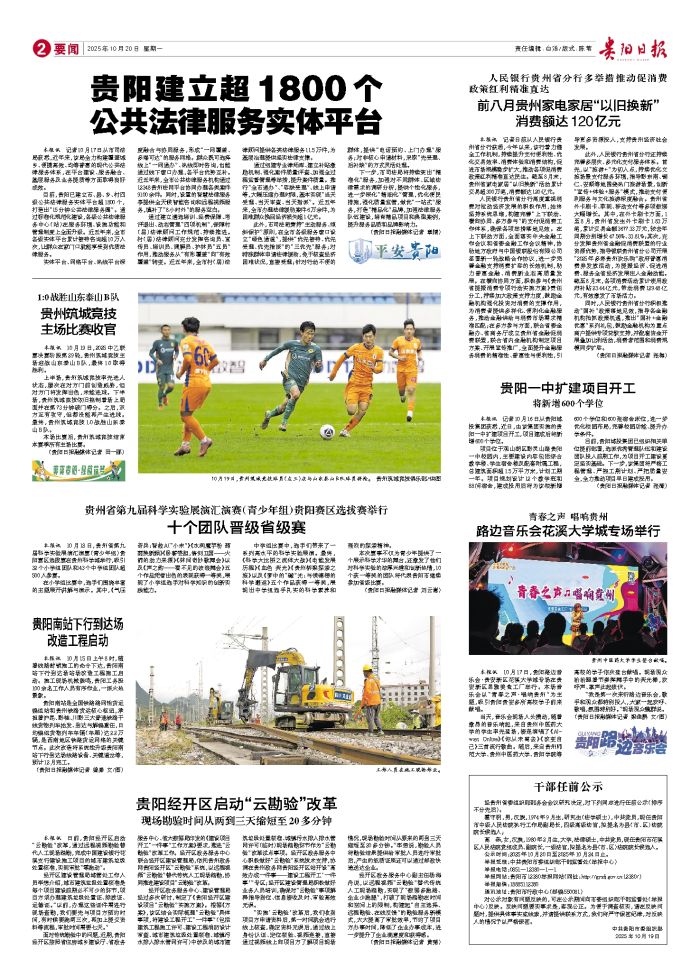 本报讯 10月19日,2025中乙联赛决赛阶段第29轮,贵州筑城竞技主场迎战山东泰山B队,最终1:0取得胜利。 上半场,贵州筑城竞技率先进入状态,屡次在对方门前创造威胁,但对方门将发挥