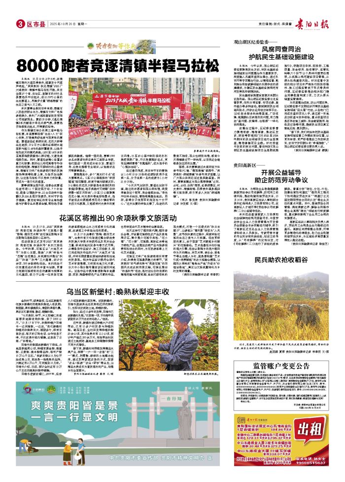 本报讯 10月19日上午8时,在清镇市清州大道四季贵州,随着发令汽笛声响起,“爽爽贵阳·跃见清镇”2025广大城贵阳·清镇半程马拉松开跑,来自全国27个省、自治区、直辖市的8000名参赛选手