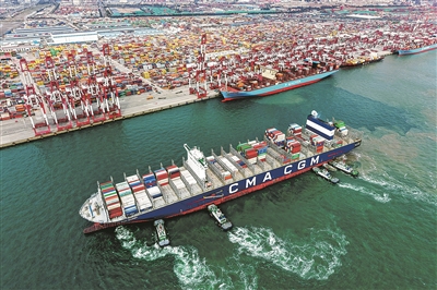 图为10月20日,在山东港口青岛港,一艘货轮在拖船辅助下停靠集装箱码头(无人机照片)。