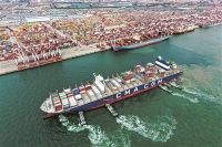 10月20日,国家统计局发布数据显示,初步核算,前三季度中国国内生产总值(GDP)1015036亿元,按不变价格计算,同比增长5.2%。 图为10月20日,在山东港口青岛港,一艘货轮在拖
