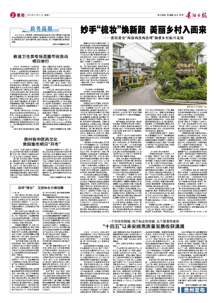 本报讯 10月20日,记者从贵州省高质量完成“十四五”规划系列主题新闻发布会安顺专场获悉,“十四五”以来,安顺市取得了“一个历史性跨越、两个标志性突破、五个显著性成效”等成绩。 经济发