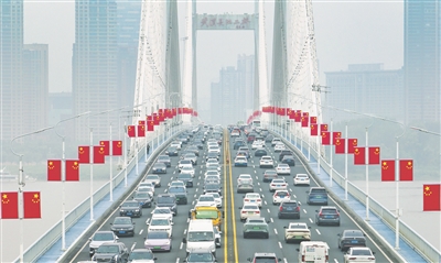 2025年10月1日,国庆假期第一天,车辆行驶在湖北省武汉长江二桥上(无人机照片)。