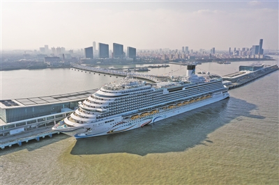 2024年1月1日,国产首艘大型邮轮“爱达·魔都号”停靠在上海吴淞口国际邮轮港(无人机照片)。