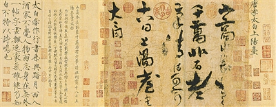 《上阳台帖》为李白自书四言诗,全文仅二十五字,此帖历经宋徽宗与诸多历代鉴藏家递藏。卷首有宋徽宗瘦金体亲题“唐李太白上阳台”,乾隆皇帝亦在引首亲笔写下“青莲逸翰”四字,足见对其珍爱有加。《上阳台帖》卷后,还附有宋徽宗、元张晏、欧阳玄、王馀庆、危素、驺鲁以及乾隆皇帝等人的跋文,自北宋以来流传有序,是现存唯一的李白法书墨宝,启功先生称此帖“字迹磊落”,梳理“它的流传经过,是历历可考的”,因此赞誉其为“肉迹”,称见其字犹如见到李白本人。