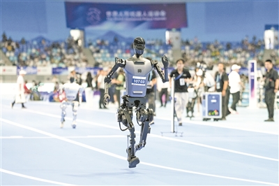 ▶2025年8月17日,在世界人形机器人运动会4×100米接力决赛中,来自天工队的人形机器人(前)在比赛中。