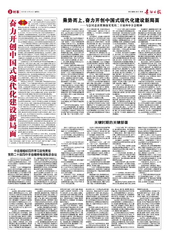 谋划新蓝图,开创新局面。党的二十届四中全会10月20日至23日在北京举行。会议审议通过了《中共中央关于制定国民经济和社会发展第十五个五年规划的建议》。 会议期间,部分与会同志围绕学习领会
