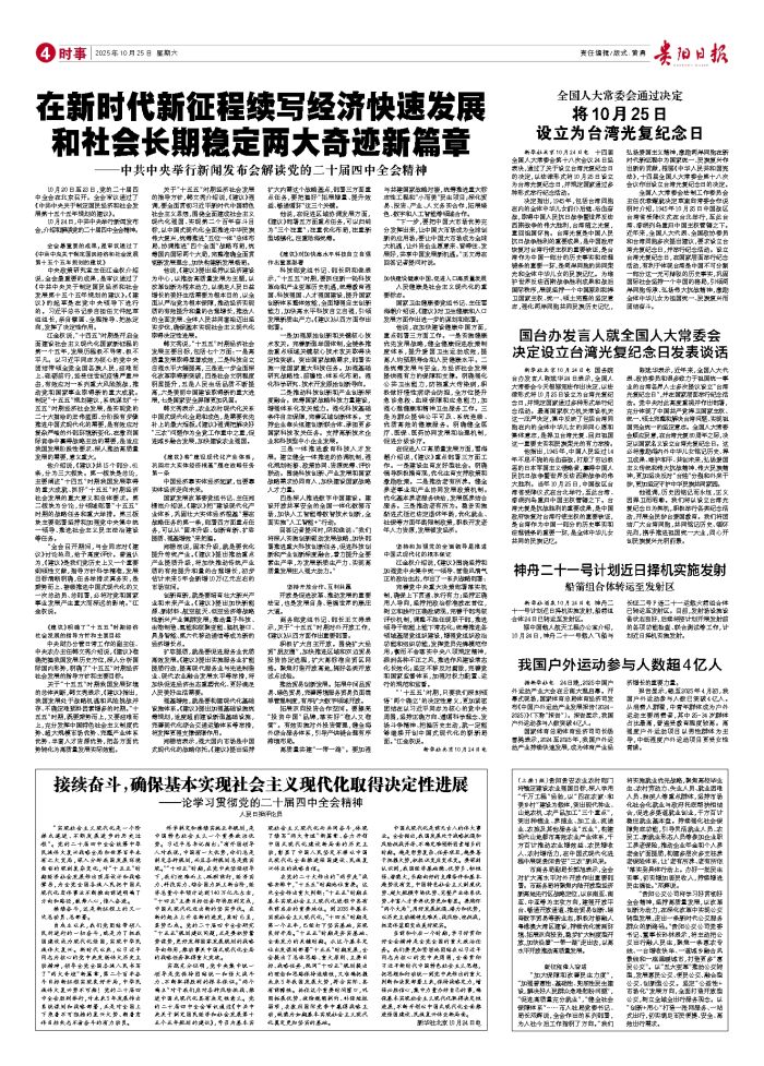 贵阳日报融媒体记者 彭刚刚 衣琼 李佳旭 庭静 张薇 10月20日至23日,中国共产党第二十届中央委员会第四次全体会议在北京举行。全会审议通过了《中共中央关于制定国民经济和社会发展第十五