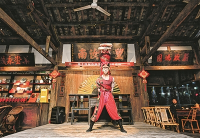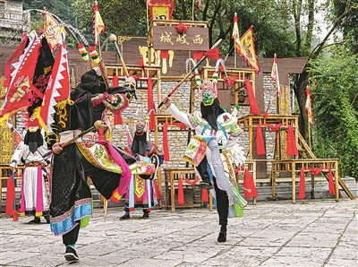 近日,新时代中国调研行之文化中华进贵州安顺,感受屯堡文化。 数百年前,明朝军队在西南边陲屯田驻扎,逐渐形成了融合明代古风、江南特色和军旅文化色彩的屯堡文化。作为屯堡文化的核心区之一,贵州安顺保留着鲍家屯、天龙屯堡等原汁原味的屯堡村落。以石头工艺为主的屯堡建筑和民间戏种安顺地戏是屯堡文化的重要文化符号。图为地戏艺人在贵州安顺天龙屯堡古镇表演。 新华/传真