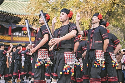 10月27日,一场民族舞蹈快闪活动在新疆乌鲁木齐市人民公园热闹开展。第十五届中国舞蹈荷花奖民族民间舞参赛队、云南省歌舞剧院的舞蹈演员现场演绎经典舞蹈片段。活动还特别邀请市民和游客参与互动,让大家近距离感受民族舞蹈魅力。图为云南省歌舞剧院的舞蹈演员现场演绎《望山》片段。 新华/传真