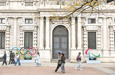 10月29日,在意大利米兰,人们经过米兰市政厅前的奥运会、残奥会会徽。 新华/传真