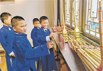 学生在非遗芦笙工坊参观芦笙制作工艺。